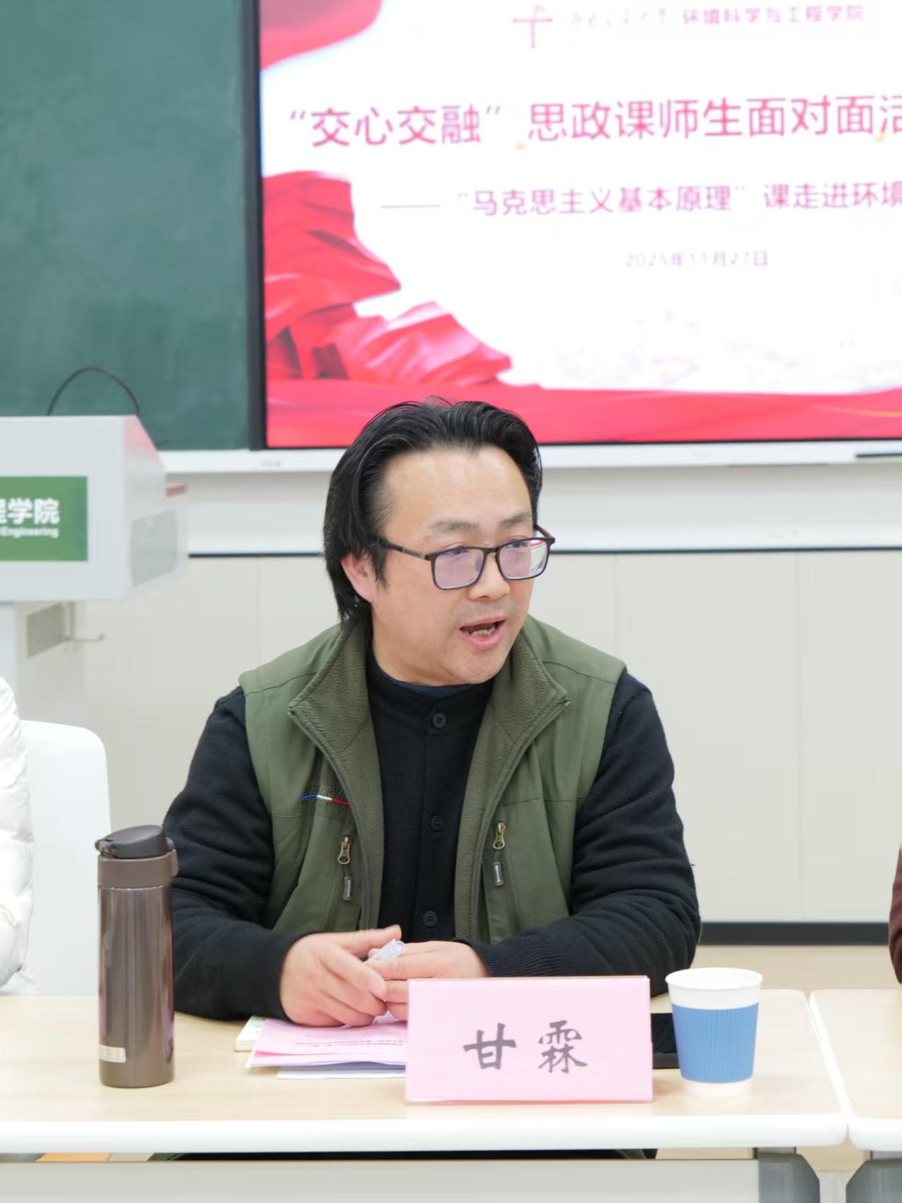 活动最后,环境科学与工程学院党委书记甘霖作总结讲话。他高度肯定了本次活动取得的成效,指出师生在交流中凝聚的“专业+思政”融合共识,正是“交心交融”活动的核心价值所在——让理论不再“高高在上”,而是落地生根;让专业成长紧扣时代脉搏,锚定美丽中国建设的使命坐标。也期待学院与马克思主义学院紧密携手,共同推动思政教学创新与育人成效再上新台阶。