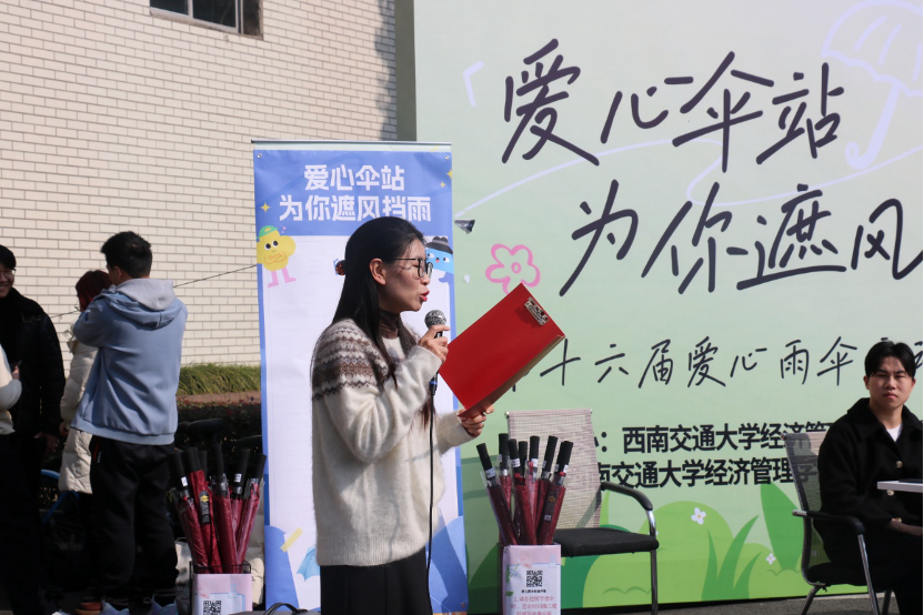 首先,经济管理学院团委书记贾佳、党委副书记余小英先后为本次活动致辞,指出本次活动旨在解决广大师生在突发性降雨天的用伞需求,让交大师生们实实在在感受到爱心雨伞的温暖与便利。同时也提示了相关使用事项,呼吁同学们注意爱心雨伞的日常维护,做到诚信用伞,让爱心雨伞更好地完成它的使命。通过校园生活中点滴的爱心之举,营造校园温馨互助的氛围,构建和谐诚信的校园文化环境。随着志愿者撑开象征着爱心与温暖的红色雨伞,余小英老师宣布爱心雨伞活动正式启动。