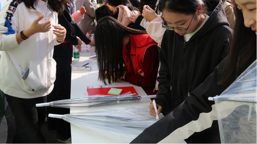 启动仪式活动期间,志愿者们积极地向路过师生介绍本次活动内容及雨伞借用流程。同时,为丰富此次活动,营造出温馨趣味的氛围,志愿者们还设置了互动环节,幸运同学可在爱心雨伞上进行现场作画和涂鸦。通过爱心雨伞DIY,让一把把带有俏皮可爱的专属涂鸦雨伞,组成交大一道亮丽的风景线。