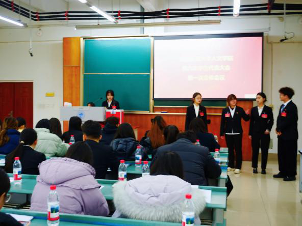 校学生会主席团成员李嘉琪、校研究生会主席团成员马明宇分别上台致辞,高度评价并充分肯定了我院学生会、研究生会组织工作,希望学生会、研究生会始终坚守“全心全意为同学服务”的核心宗旨,扎实推进各项工作;胸怀远大理想、牢记学生本分,以更严格的标准要求自己,不断提高工作整体水平和能力,在实现中华民族伟大复兴的征程中彰显青春担当。