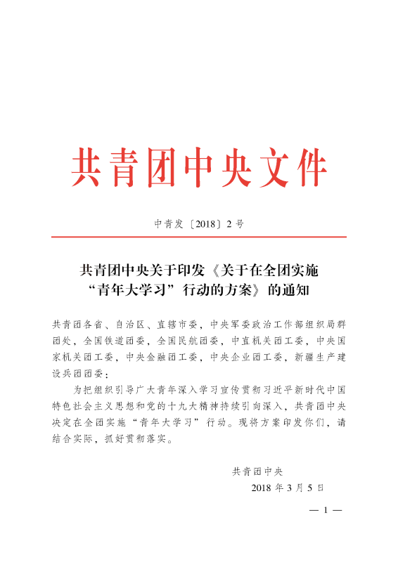 2018年3月5日,共青团中央发出《关于在全团实施“青年大学习”行动的方案》