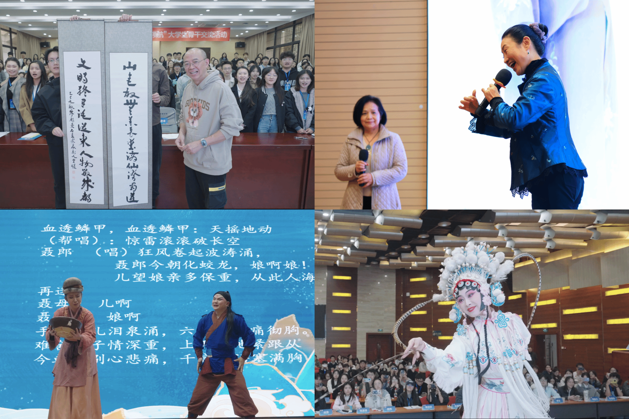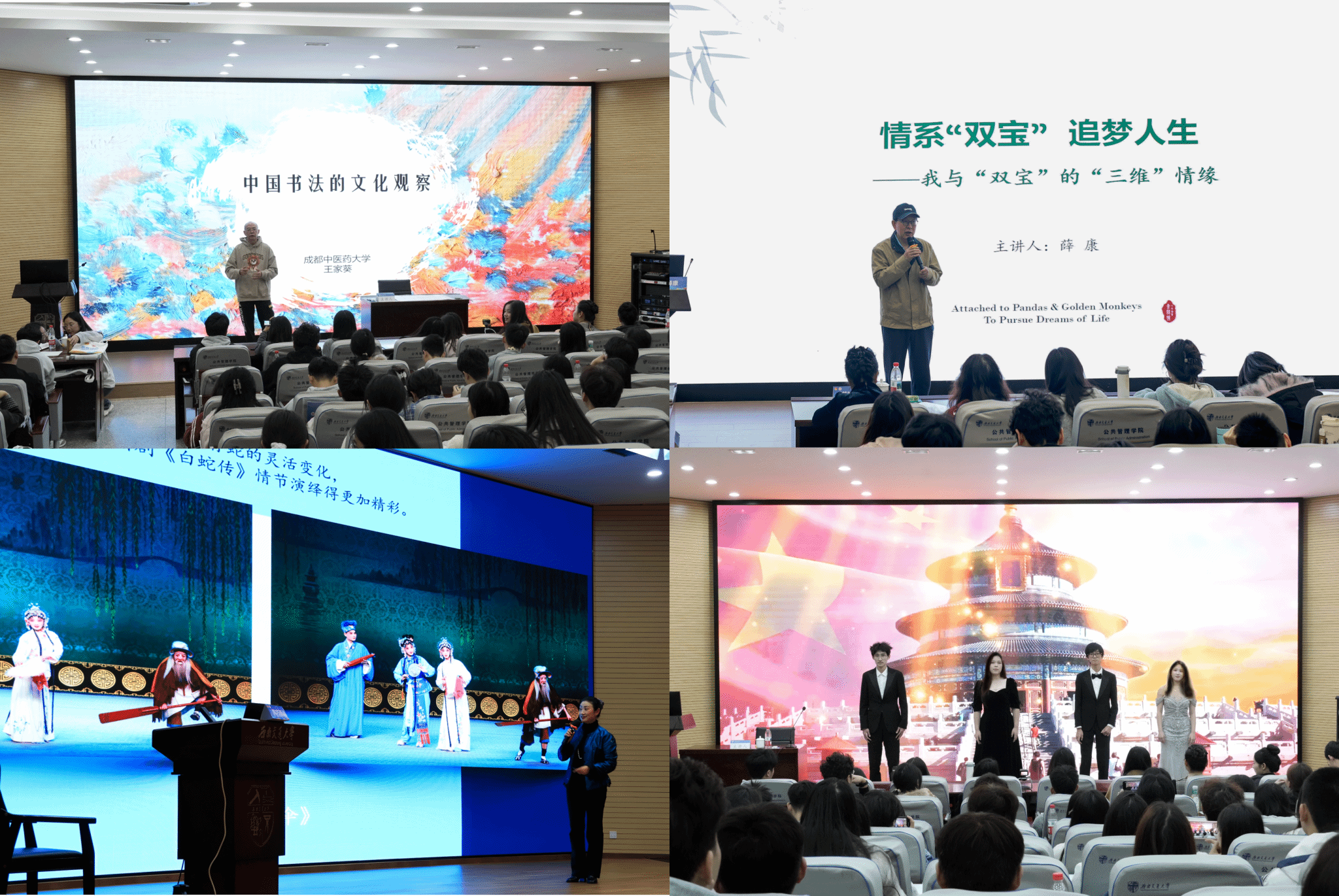 中国双宝文化学者、摄影艺术家、成都大学中国双宝文化研究中心主任薛康以“情系‘双宝’ 追梦人生”为主题,分享了他与“双宝”的三维情缘;国家一级演员、成都市川剧研究院常务副院长陈巧茹带来“传川剧经典,承蜀地文化”非遗川剧进校园活动,与同学们进行面对面交流;省书协副主席、文化传播委员会委员、成都中医药大学教授王家葵作中国书法的文化观察主题授课。