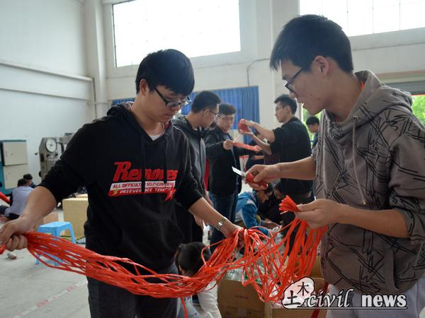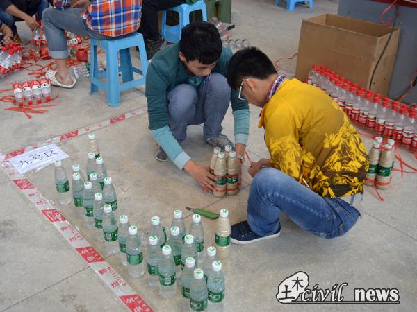 每一组的比赛时间分为三个阶段:准备时间、制作时间和加载时间。早上7点40分第一场比赛的选手来到实验中心门口,这时组委会的工作人员已经把比赛用品放置在了每个制作区内。选手们首先对比赛的用具进行了检查。因为隧道模型由塑料瓶制成,所以对瓶子的要求比较高。准备时间用来调换不合格的瓶子。十分钟之后,选手们开始制作。各个组的同学在制作时分工很是明确。记者在开始之前的采访中了解到,选手们已经提前模拟过,比赛的时候该如何施工已清晰明确。选手们的模型制作分为两大方式。一种是对塑料瓶进行加工处理,套在一起,最后弯成拱形。另一种是保持塑料瓶完整的结构,通过捆绑成拱形。在加沙和加水的处理上各个组的选手也都有着自己的不同理解。