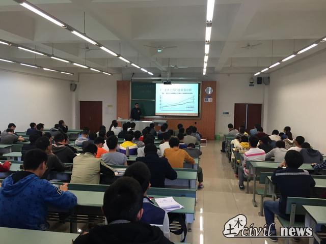在一片热烈的掌声中,蒋老师开始了讲解。他主要从“土木行业的前景分析”和“学生择业分析”两个方面对学生存在的包括目前的就业前景及行业的就业面等困惑进行解答。他认为土木行业在我国属于朝阳产业,有着良好的发展前景。在今后的发展中,住房需求将稳中有升而目前城市地下空间开发热潮兴起,高速发展的国情下行业存在很大的发展空间。另一方面,蒋老师又将施工、设计、监理及创业等几个职业发展方向的优势与不足详细列出,并以真实的例子进行讲述,进一步加深了在场学生的感受。最后,蒋老师也希望同学们放平心态,注重个人能力与经验的积累,积极面对走向职场后的挑战,完成自我的梦想。