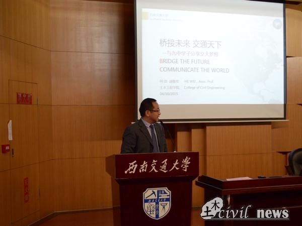 紧接着土木工程学院优秀学生代表、学生最高荣誉“竢实扬华”获得者吴天祥同学为到访的树德学子们送上寄语。他向大家展示了自己在大学取得的成绩,展现了大学的精彩,希望同学们能好好努力为明天创造辉煌。之后来自树德中学的康善之说道,“接触土木这个专业,让我深刻感受到交大的魅力,而如今我更是收获到必须以坚定的信念和科学合理的规划才能创造好明天,希望以后的大学生活能更精彩。”讲话结束后,土木工程学院桥梁工程工程系何畏副教授向大家介绍了西南交大的建校史和在历史上、国际上取得的优异成绩。