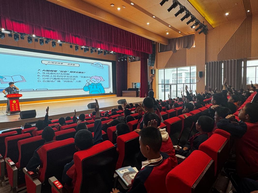 为了巩固所学知识,活动还设置了AI知识竞赛环节,通过趣味问答形式,让大家在问答中巩固所学知识,赢得精美礼品。互动中学子们积极举手参与,现场气氛热烈而活跃。
