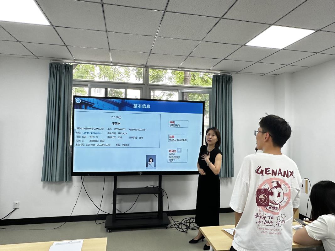 随后,朱老师详细讲解了简历制作的基本方法。她介绍,一份完整的简历通常由个人基本信息、教育背景、项目经历、社会经历、获奖与荣誉及其他部分构成。针对不同经历的同学,朱老师给出了差异化建议:大学生涯丰富的同学,应围绕求职意向和岗位需求,对经历进行精简,做到详略得当;而经历相对平淡的同学,则可细化每个项目,将教学实践、课程学习、各级奖励及技能等内容充分展现,并适当补充自我评价,以此丰富简历内容。此外,朱老师特别强调,简历制作务必遵循真实性、简洁性和客观性原则,采用倒叙方式呈现经历更符合人们的阅读习惯。