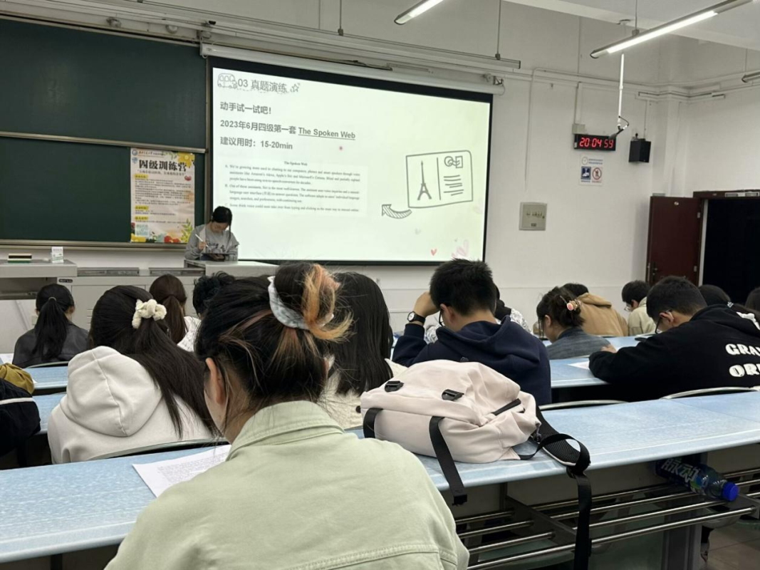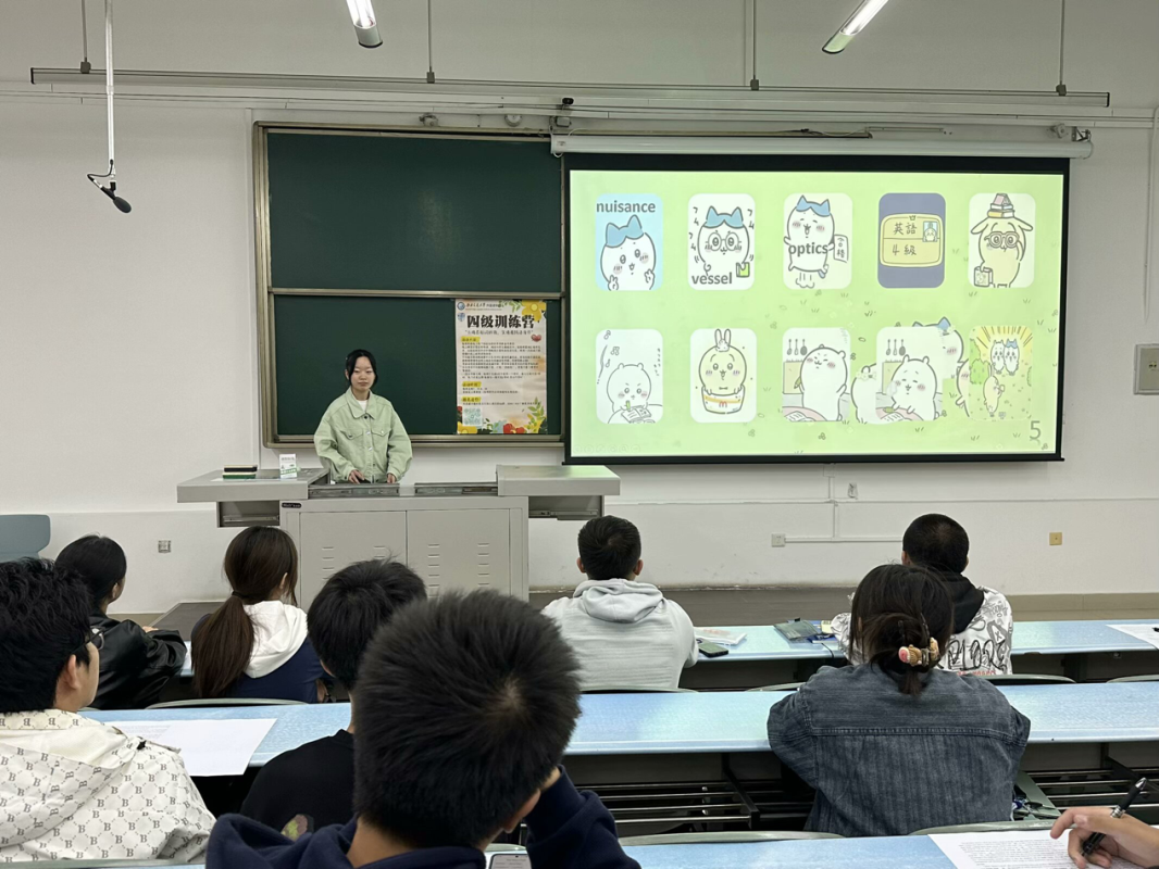 课堂回顾:四级提升营每周开展活动。课前20分钟,志愿者组织四级词汇训练并设置许多单词游戏,让大家参与到英语学习的氛围当中,随后针对阅读、写作等板块进行技巧讲解与真题练习。