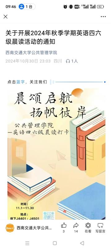 为提高广大同学的英语学习热情,促进英语口语学习习惯的养成,公共管理学院学生会于2024年11月1日开始开展了为期一个月的英语四六级晨读打卡活动。