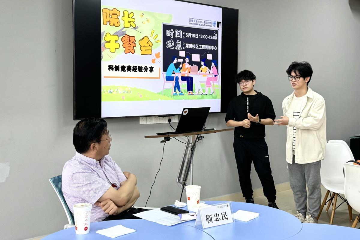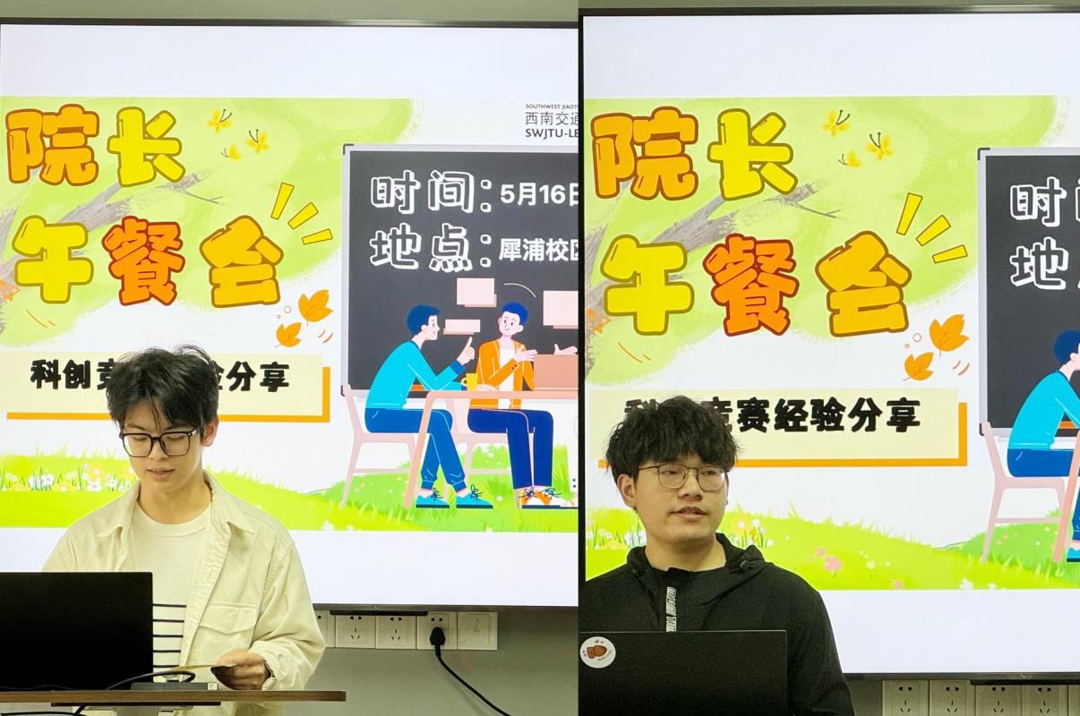 5月16日中午,利兹学院在犀浦校区工程训练中心(利兹学院工程实践与创新国际联合中心)举办了2023-2024学年第2学期第二期院长午餐会,本次活动主题为“科创竞赛经验分享”。利兹学院院长靳忠民、副院长赵舵、党委副书记刘耀谦、学生支持中心辅导员李东杰、刘爽和18名学院学生代表参加本次活动,2021级计算机科学与技术专业的宁晟与宋明富做主题经验分享。