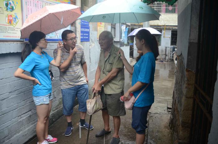 8月13日上午,西南交大考察服务团15名师生冒雨来到雨湖区窑湾,在一座座古老的建筑中间寻找当年学院在湘潭办学的点滴踪迹。最终,在周磊、何歌劲带领下,大家找到了当时学生上课的钱家巷湘乡会馆、住宿的礼拜堂,并在礼拜堂前采集了一袋泥土,将带回成都校园,融合成“交大的足迹”雕塑。