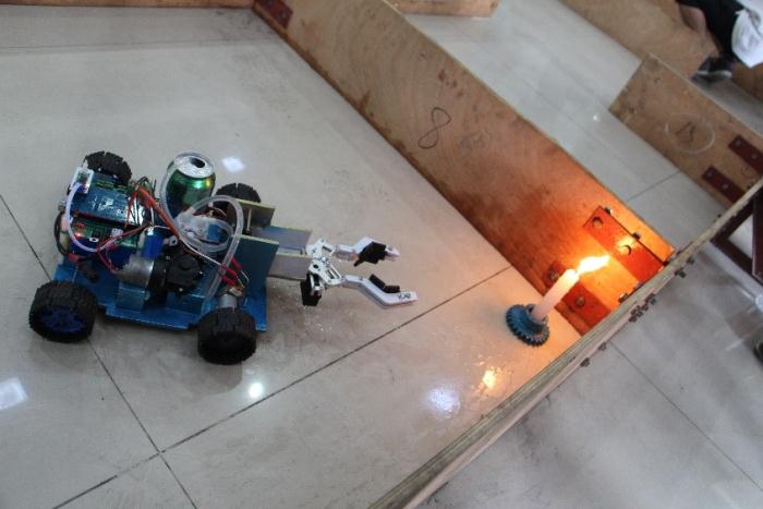 当天中午12点30左右,经过初审、预检后的15个队开始签到。接下来由裁判宣布注意事项和评判要点。13点整,比赛正式开始。本次比赛以火灾救援为主题,各参赛队伍需操控机器人熄灭两个火源然后搬运己方的易爆物及抢夺中间的易爆物到达指定地点,比较哪一组的机器人能够以最快速度完成比赛。在比赛场上各参赛队伍带着自己的制作的火灾救援机器人各显神通,风扇灭火,用水灭火,借助气球灭火,各队伍创意不断,相当漂亮的完成灭火任务,在搬运易爆物的过程中更是触动在场所有人,都为机器人能否顺利的把易爆物顺利的运到指定地点紧张不已。15点左右,经过两个多小时的比拼,预赛结束。