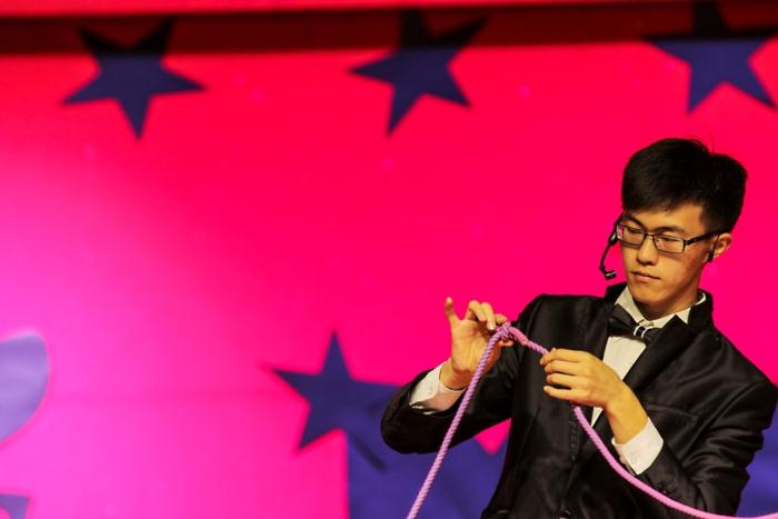 开场秀则是技术部部长丛德明委婉而含蓄的表演,直接让在场的观众进入了魔术晚会的主题,值得一提的是这个开场秀的魔术掺杂着梁祝化蝶的典故,也让整场晚会在开头在魔术的神奇的元素中则更是添加了中国风的元素。之后张重阳同学则更是用幽默诙谐的语言用几根绳子变幻出各种神奇而奇妙的效果,神奇的绳子在张重阳的手中轻松的变为两节,而又只在他轻轻吹的一口气下又神奇的回复成原绳,绳子在他的手中来来回回变换无穷的效果让在场的观众更是惊叹不已。