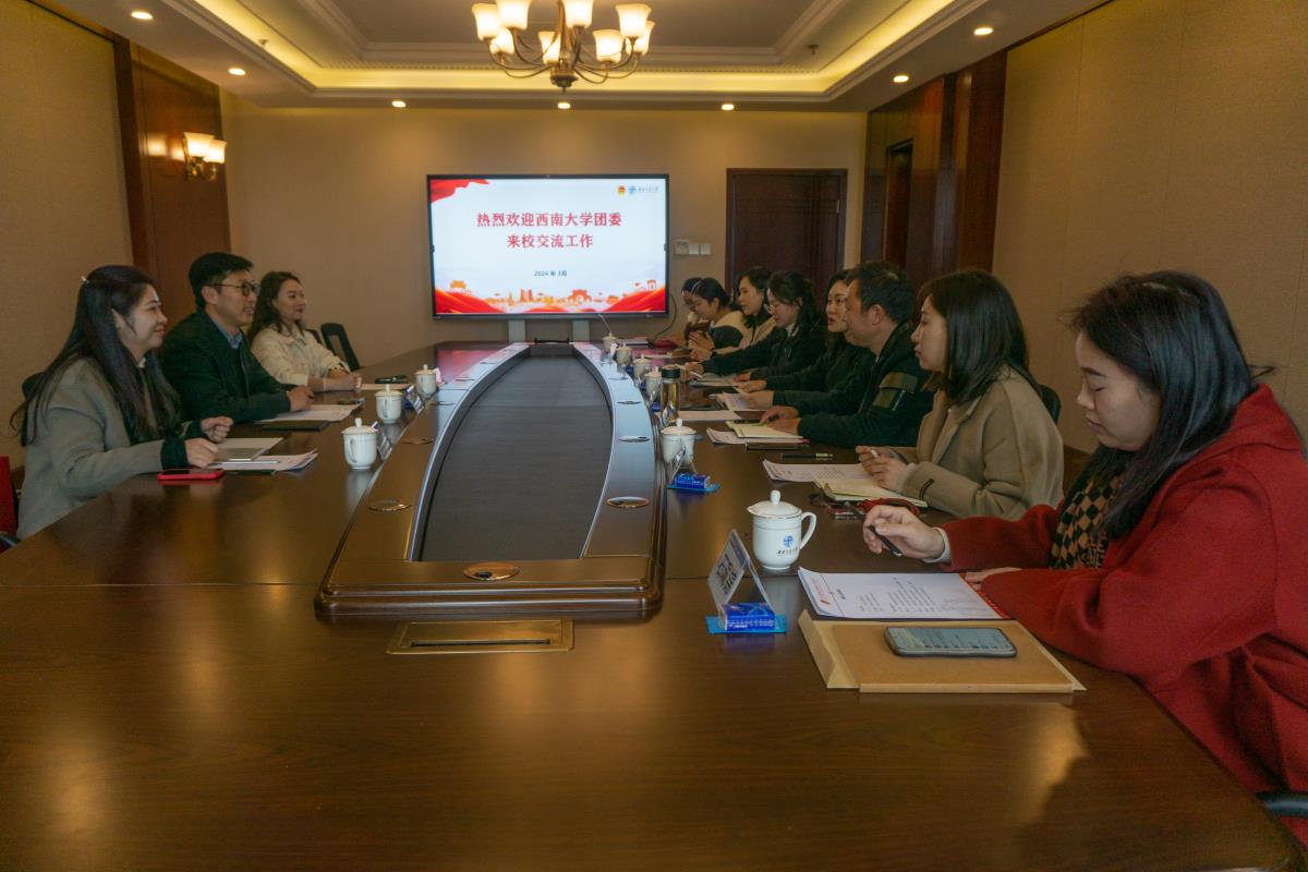 3月4日下午,西南大学团委书记于涛带队来校调研交流共青团工作。学校党委副书记高平平会见了于涛一行,他高度评价西南大学共青团工作,希望两校共青团加强合作,不断探索团建工作新思路和新方法,为青年学生成长成才提供更多更好的平台,为成渝双城经济圈建设贡献两校青年的智慧力量。