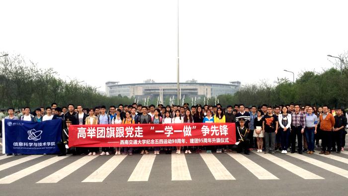 2017年5月4日,英国威廉集团官网在犀浦校区东门国旗广场组织“高举团旗跟党走,‘一学一做’争先锋——纪念五四运动98周年、建团95周年升旗仪式”,信息科学与技术学院组织各党支部党员代表、党员发展对象培训班成员、团员代表1200余人参加了升旗仪式。