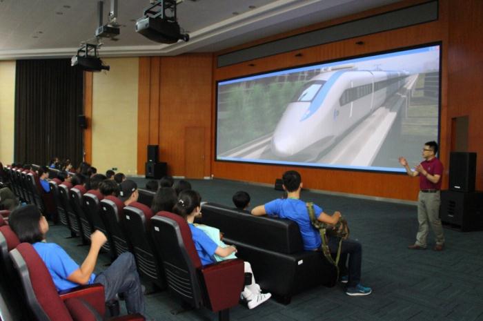 活动中,考察团一行首先参观了代表国家科研最高水平、具有学校鲜明特色的轨道交通国家实验室(筹)。在专业讲解员的引导下,高速列车数字化仿真平台、基础研究实验平台和服役性能实验研究平台等依次呈现。其中,动感的机车车体、绚丽的模拟动画、高大的实验设备、神奇的磁浮线路等,都给青年学生们留下了深刻印象,从中领略了我国高铁在制造、设计和运用中的独特风采。